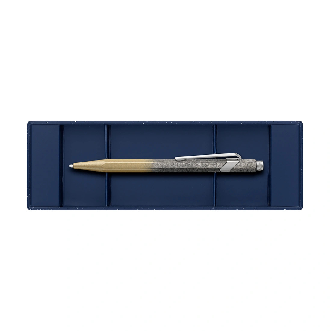 Cuerpo hexagonal de aluminio, ligero y resistente Diseños inspirados en un look lunar y colores cósmicos Cuerpo de aspecto aleatorio fruto de la técnica de tribofinición Cuerpo gris lunar y lacado dorado en la punta Clip y botón de terciopelo cromado