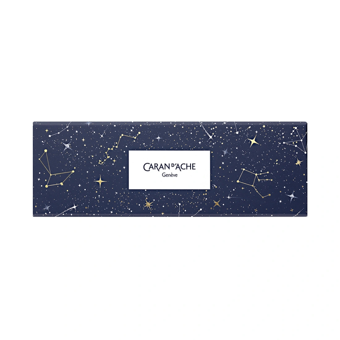 Caja de cartón de primera calidad en azul noche recubierta de motivos galácticos dorados y blancos, apertura deslizante Funda a juego Dimensiones: 18,2 x 6,5 x 2,4 cm Peso: 90 g (75 g sin el producto)