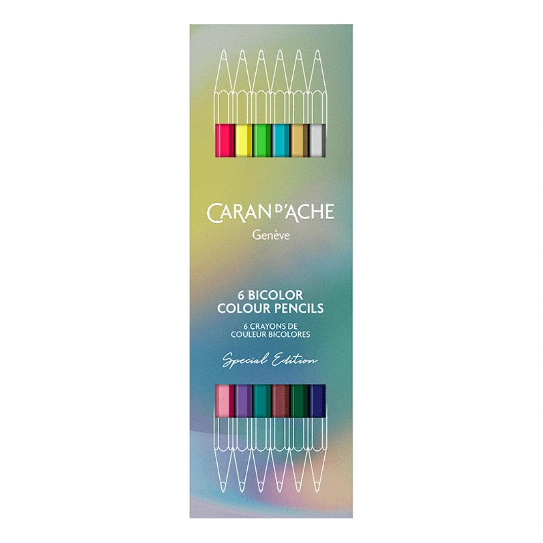 Estuche de 6 lápices exclusivos bicolor, 12 colores: 3 minas fluorescentes 3 minas metalizadas 6 minas estándar 3 minas Fluo-Minen Silver Caran d'Ache + Swiss Made + logo FSC™ estampado en caliente en la cara 1 mina suave y resistente de 2,8 mm