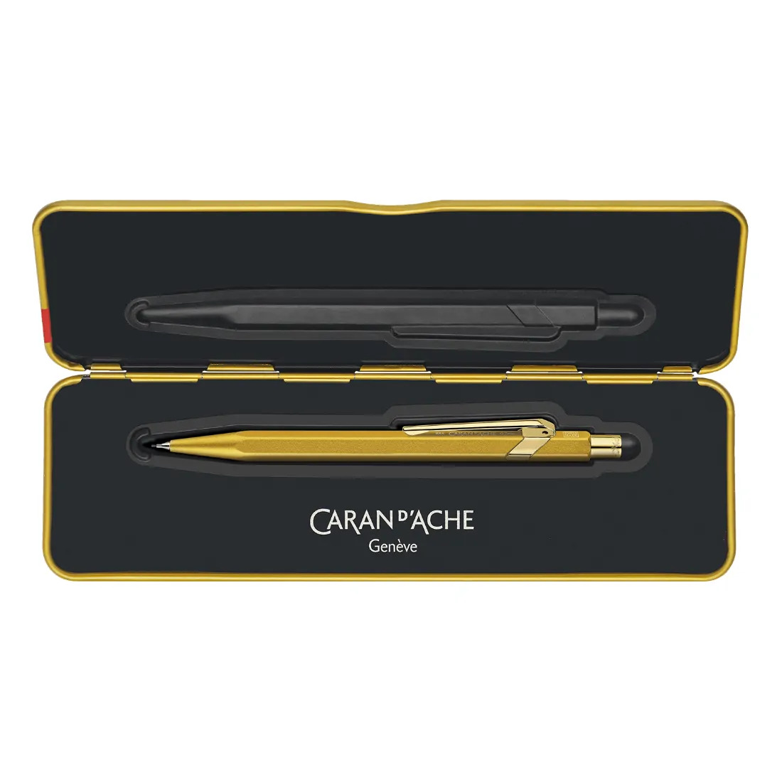 Cuerpo hexagonal de aluminio, ligero y resistente Acabado oro amarillo satinado Clip metálico flexible a juego Pulsador metálico a juego con goma de borrar y recámara con minas de repuesto de Ø 0,7 mm incorporadas en la parte trasera, accesible quitando el pulsador