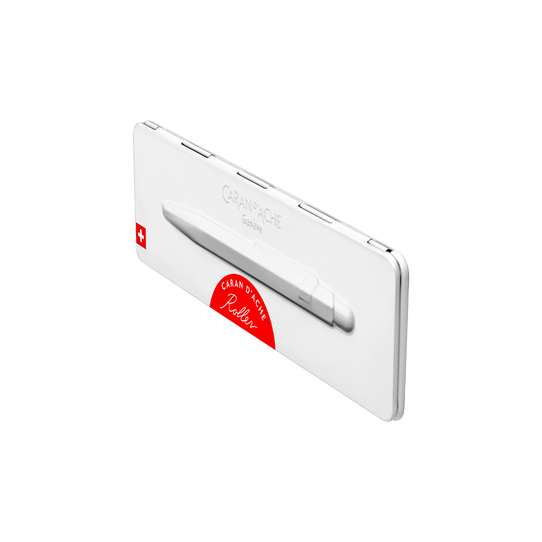 Slimpack de metal blanco con pegatina a juego con el modelo 849 Roller e indica la forma de escritura del roller. Dimensiones: 19,9 x 5,9 x 1,7 cm
