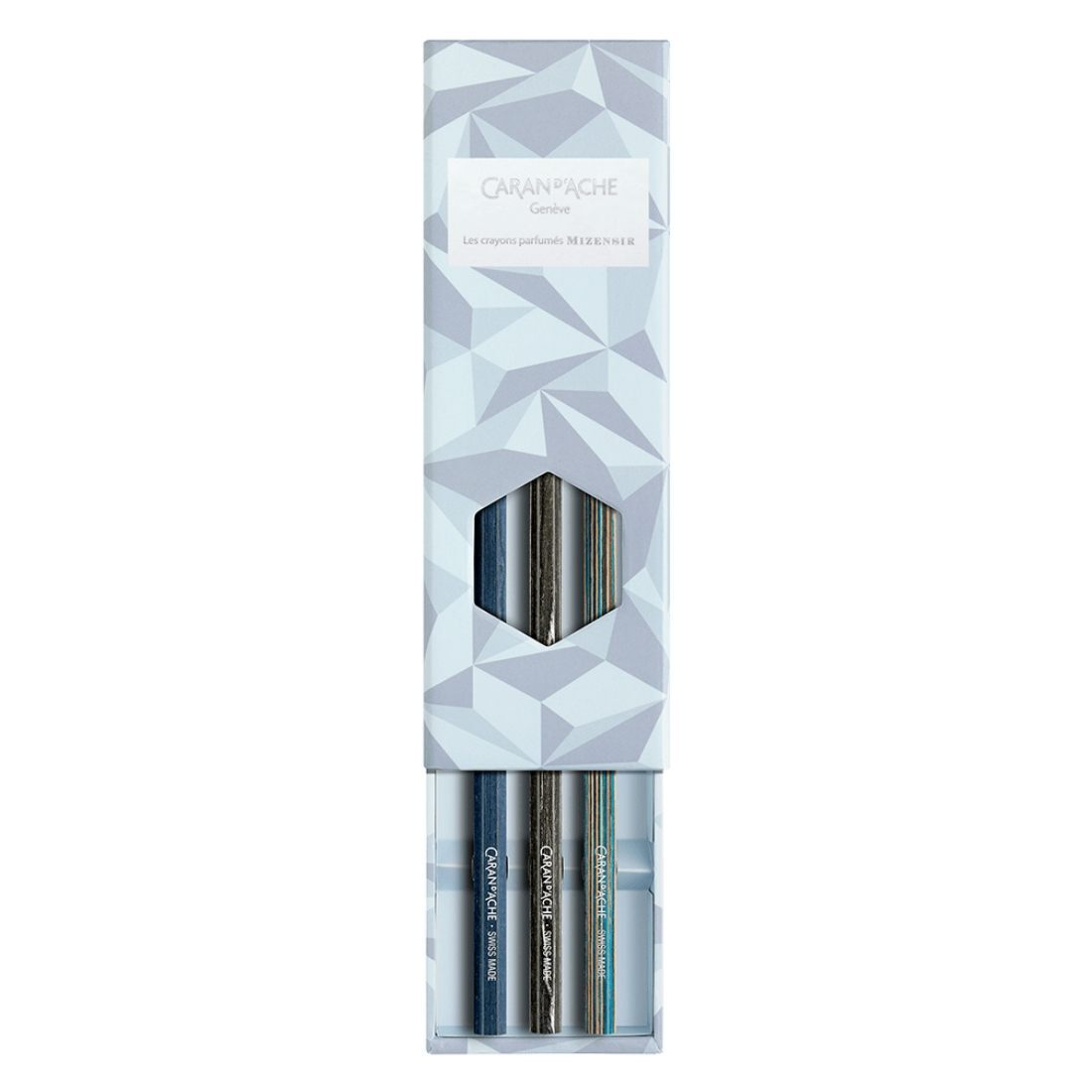 Caja de cartón premium decorada con motivos geométricos en blanco y azul helado inspirados en el efecto facetado de la escarcha invernal Ventana recortada en forma de isotipo Caran d'Ache Apertura deslizante Dimensiones: 182 x 65 x 24 mm Peso: 90 g (70 g sin producto)