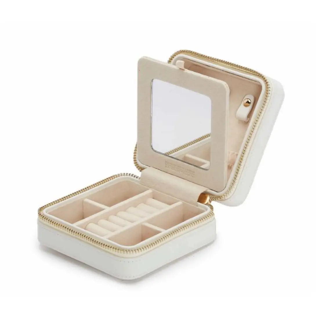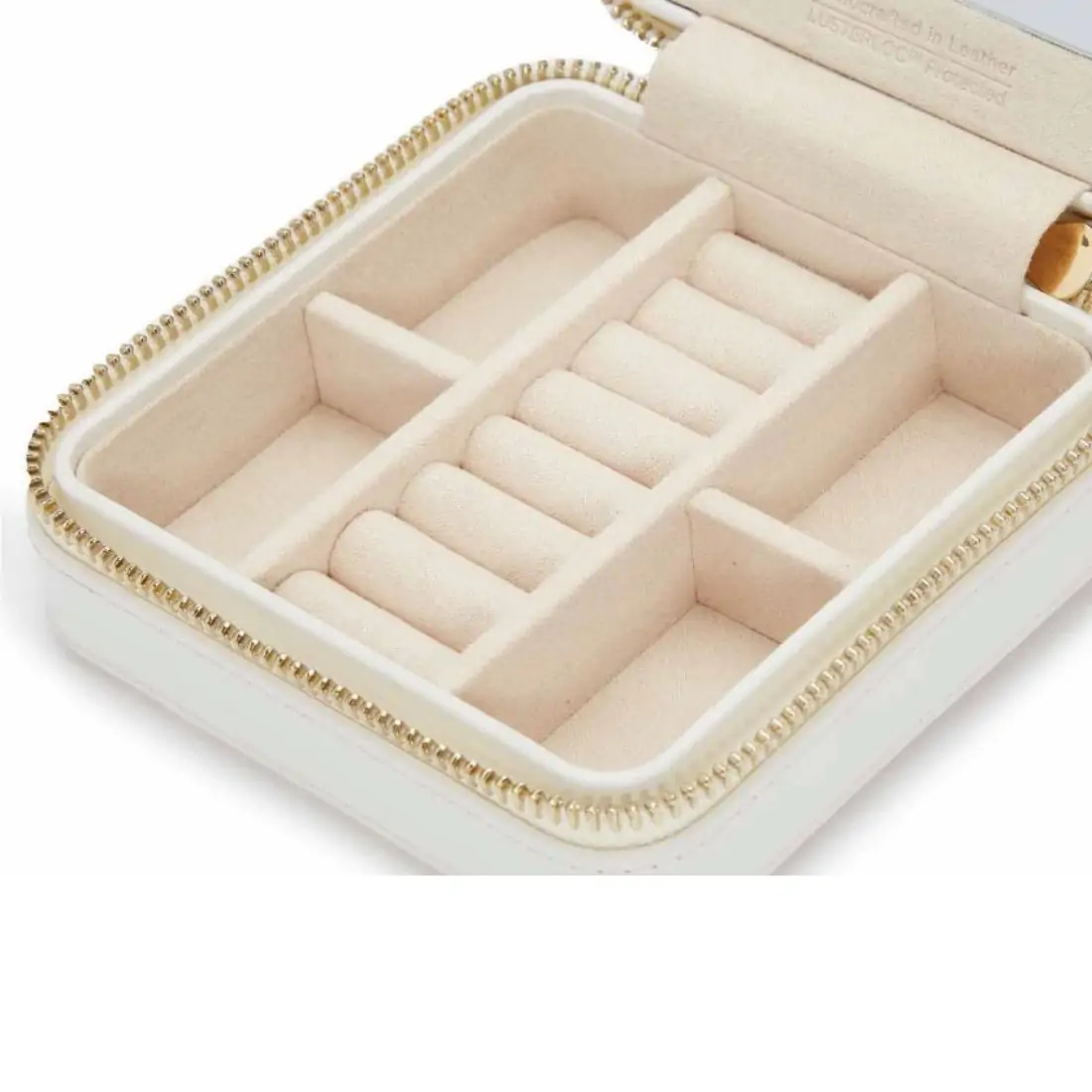 Material: Cuero Almacenamiento: 7 rollos de anillos, 4 compartimentos abiertos, 3 ganchos a presión para collares con bolsillo, 1 barra para anillos, una barra para pendientes, espejo LusterLoc™: permite que la tela que recubre el interior de sus estuches de joyería absorba los gases hostiles que causan el deslustre. En condiciones de almacenamiento típicas, puede evitar el deslustre