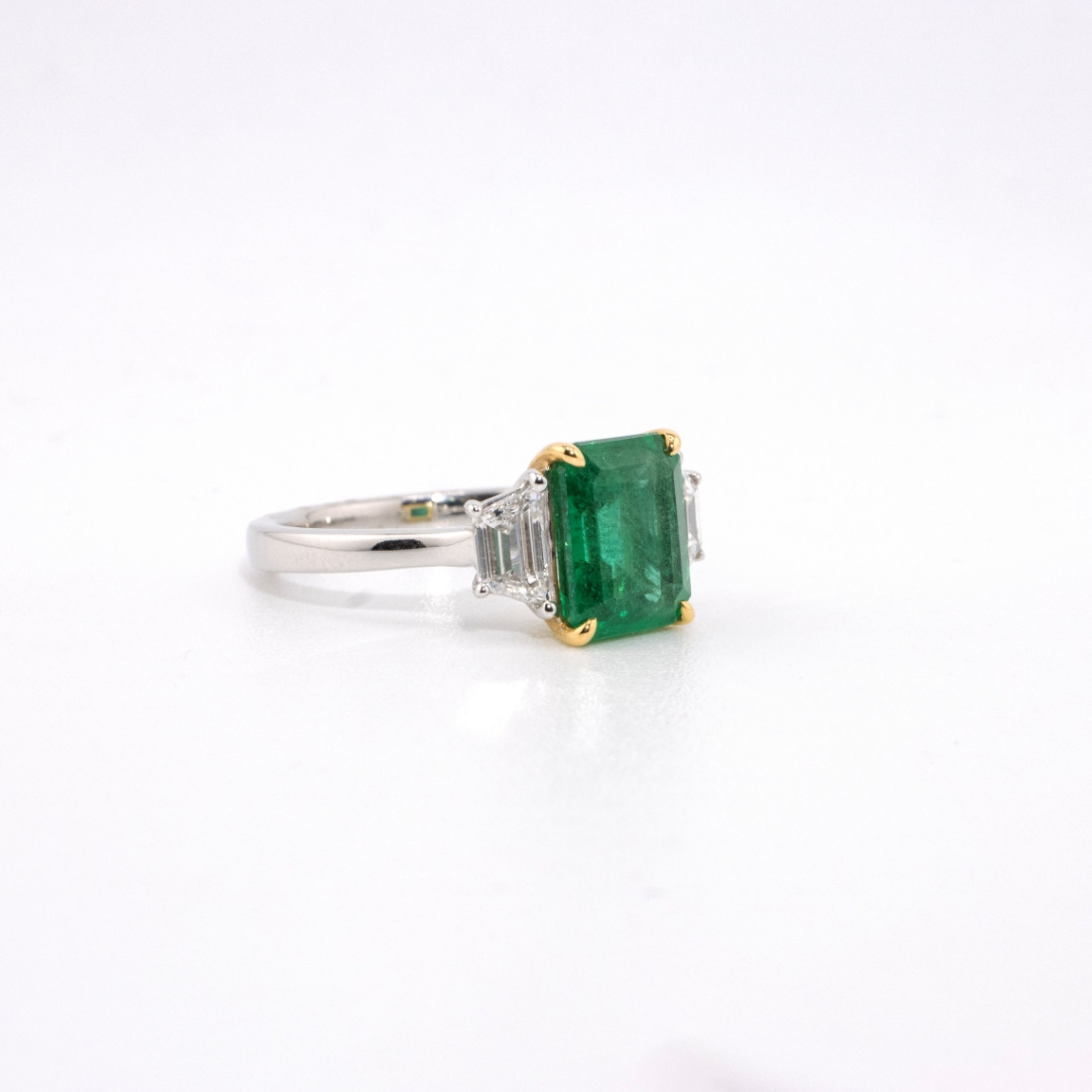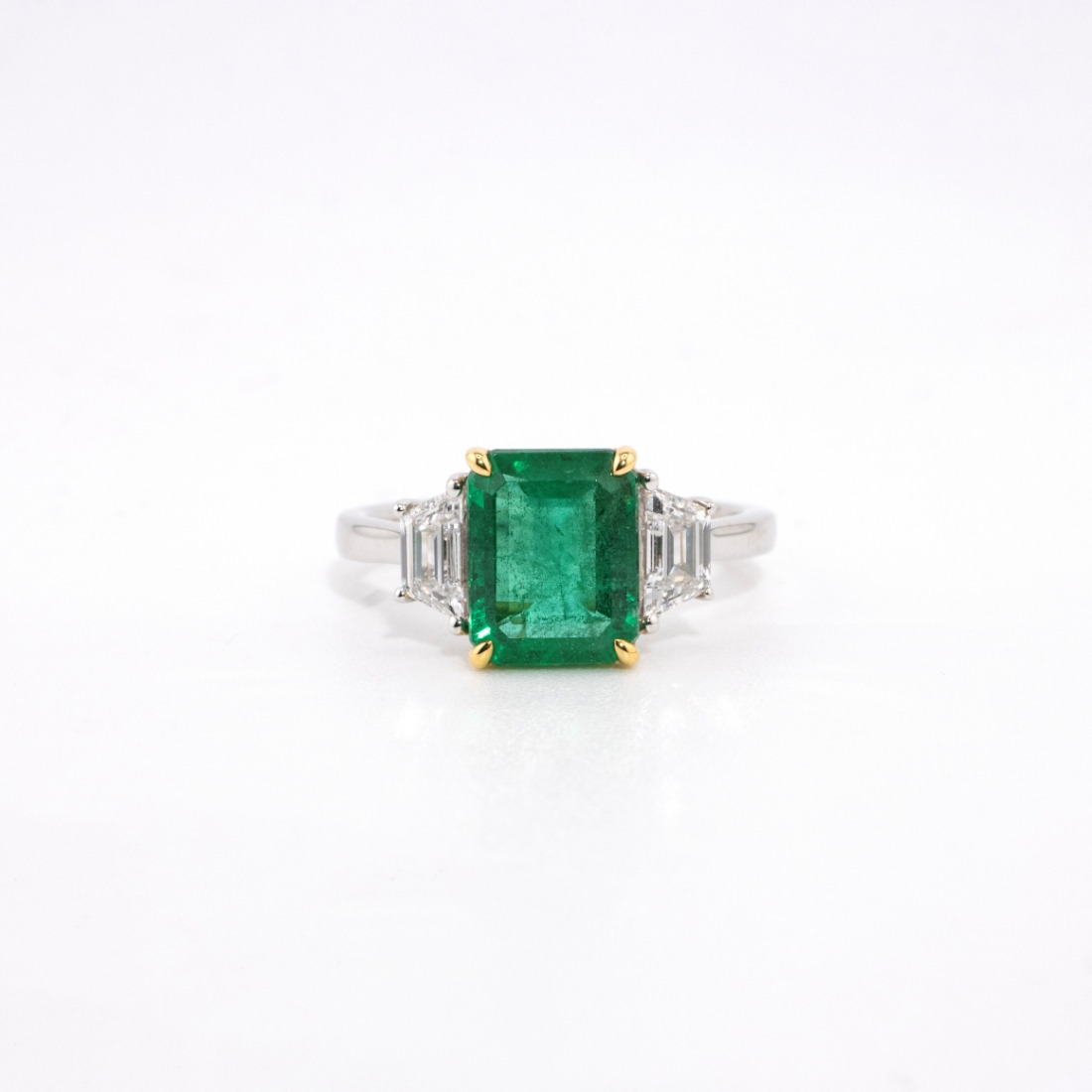 Este anillo combina la fuerza del verde esmeralda con la elegancia limpia de los diamantes baguette. Su esmeralda corte esmeralda, montada en garras de oro amarillo para intensificar su color, simboliza renovación, autenticidad y equilibrio. Los diamantes laterales aportan claridad y estructura, creando un diseño armonioso y atemporal.