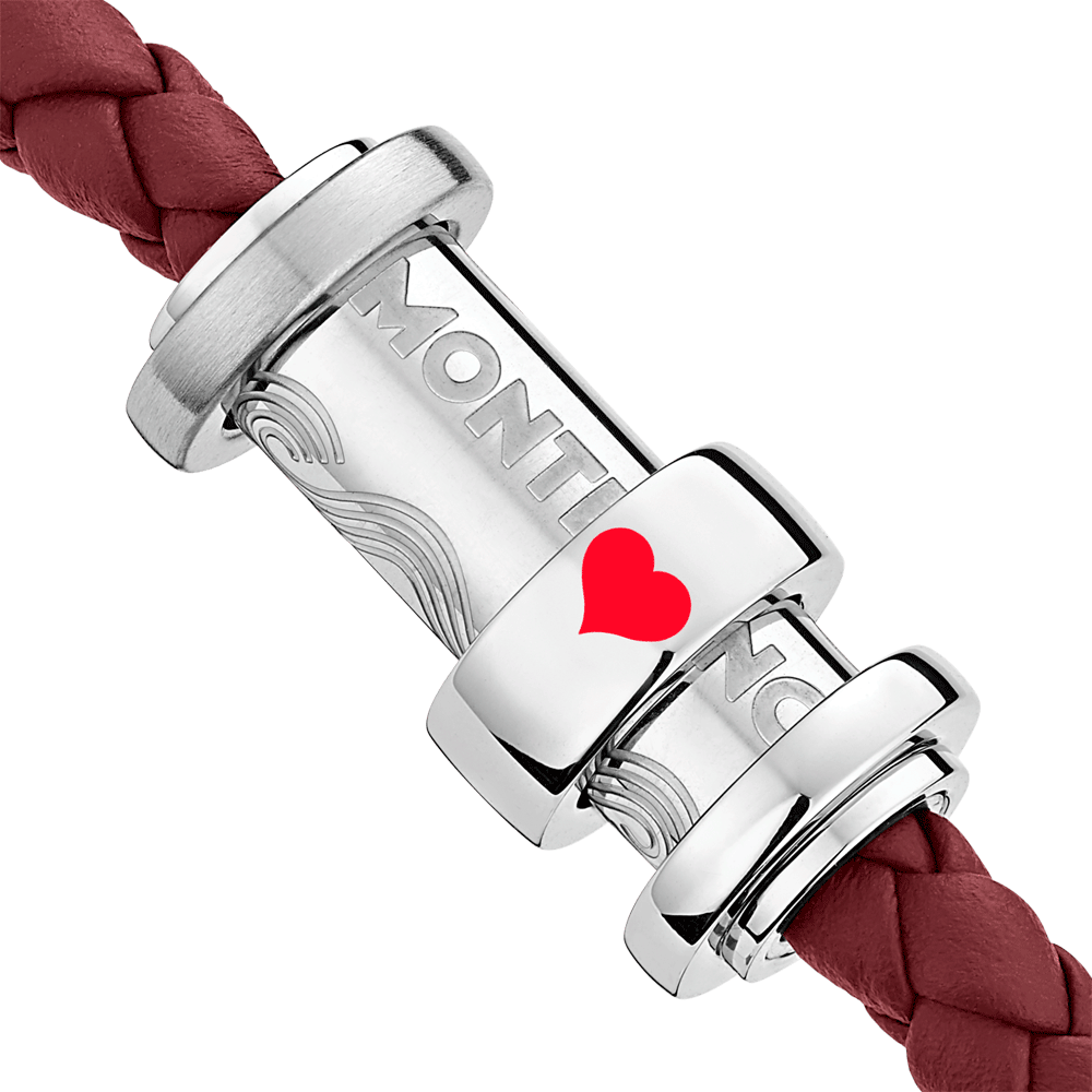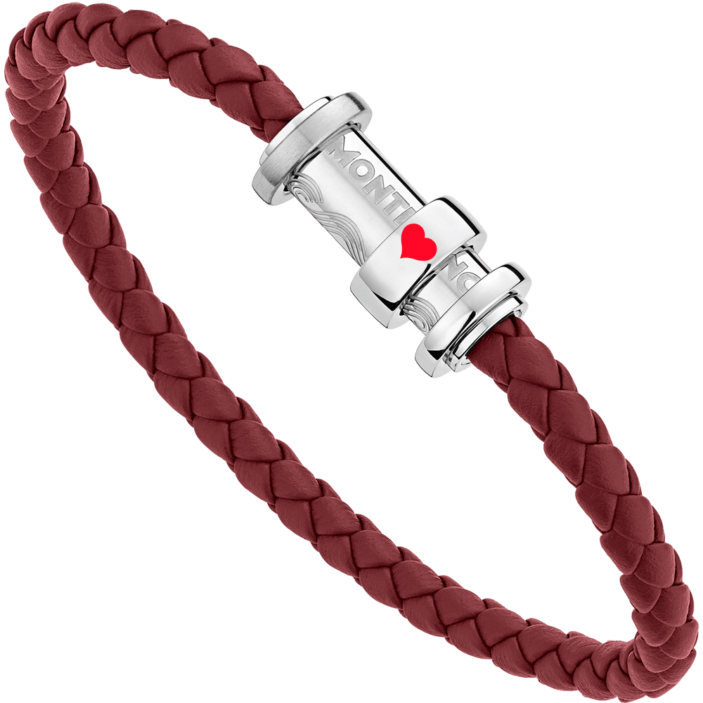 La pulsera Meisterstück de Montblanc rinde homenaje al libro "La vuelta al mundo en 80 días". Esta joya, elaborada en piel trenzada roja con un cierre de acero inoxidable pulido y un as de corazones repujado, se inspira en uno de los elementos clave de la novela: los palos de la baraja de naipes.