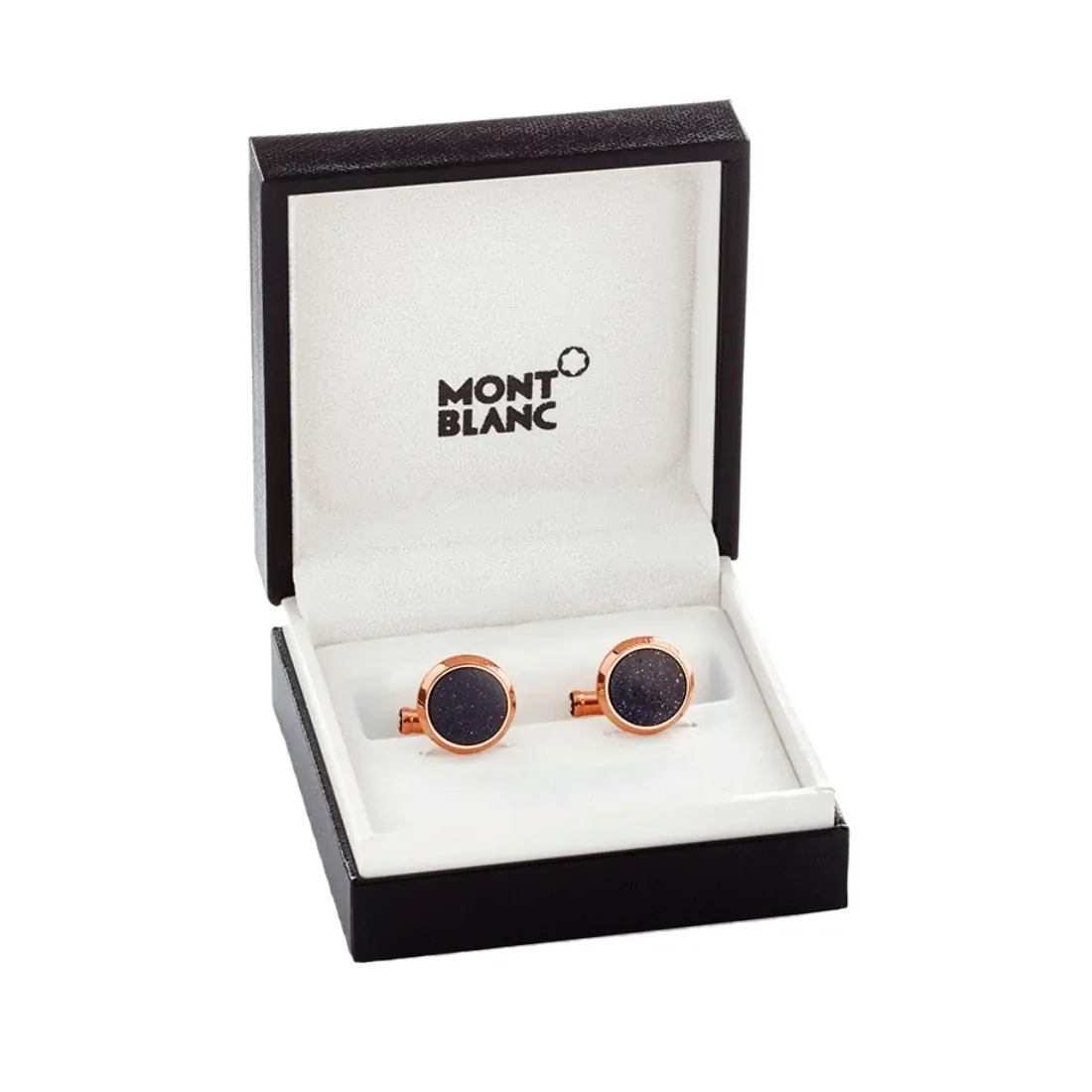 Acero con acabado PVD en dorado rosa e incrustación de vidrio de aventurina azul