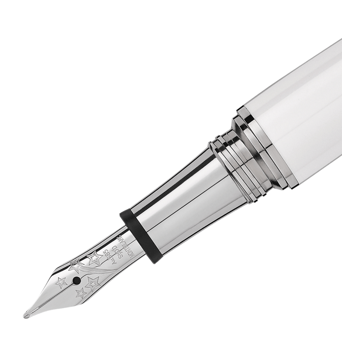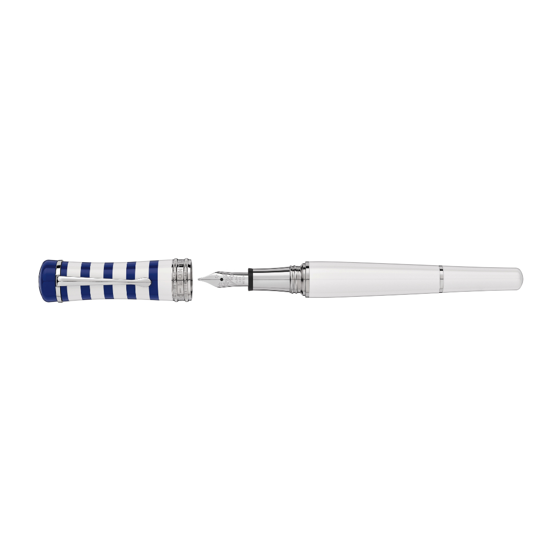 El diseño de la Bonheur Collection está profundamente arraigado en la revolución de la moda que caracterizó la década de 1920, y encarna elegancia y libertad a la vez. Luce una forma eminentemente femenina, pero la sencilla combinación de rayas de resina preciosa blanca y azul con detalles platinados representa a las mujeres liberadas del corset, luciendo siempre elegantes y con un estilo funcional. La camiseta de rayas tipo “marinière"" estaba muy de moda por aquel entonces, con su estilizado diseño perfecto para unas vacaciones a orillas del mar, que liberaba a las mujeres de las limitaciones que imponían los atuendos de esa época. Durante el siglo XX e incluso a comienzos de la década del 2000, artistas e intelectuales adoptaron la “marinière"", democratizándola, por su elegancia y funcionalidad. El plumín se inspira en el nombre Bonheur y su asociación mágica con el diseño de una estrella fugaz."