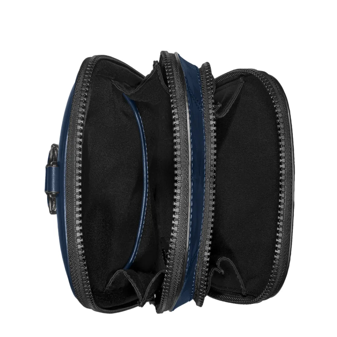 Piel repujada y graneada azul tinta con detalles de metal negro