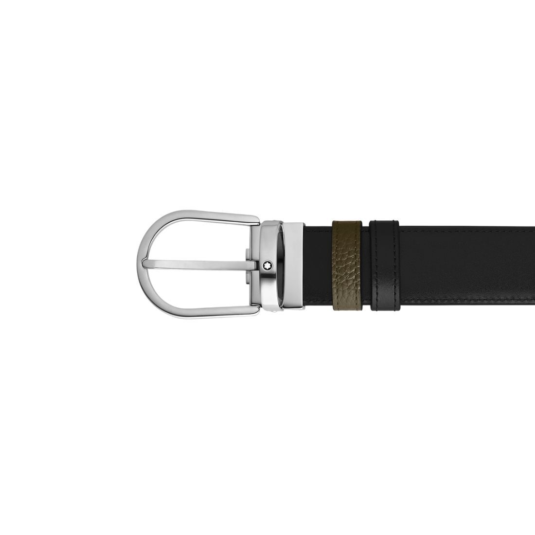 Este cinturón reversible combina una discreta elegancia con funcionalidad, ofreciendo dos estilos distintivos en un solo accesorio. Con la distintiva hebilla Montblanc en forma de herradura con acabado paladiado, un lado de la correa de 35 mm se presenta en piel graneada color caqui, mientras la contraria exhibe una elegante piel Meisterstück negra para una sofisticación clásica.