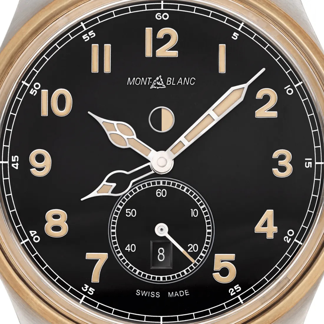 La colección Montblanc 1858 continúa reinterpretando los famosos cronógrafos Minerva de la década de 1930, con diseños distintivos y una mecánica excepcional que atraviesa el tiempo. El estilo vintage de la colección se ha mejorado aún más con la introducción del bronce, una novedad para la Maison. A través de esta elección de metal, Montblanc combina la relojería artesanal suiza tradicional con un material genuino de la historia de la relojería. Por primera vez en la industria relojera, el bronce se combina con el acero y da como resultado una combinación bicolor y bimaterial que resalta lo mejor del diseño vintage. El Montblanc 1858 Automatic Dual Time vintage con su estilo altamente reconocible presenta una esfera negra tradicional, manecillas en forma de catedral y números arábigos Super-LumiNova® beige. El reloj viene en una caja de acero inoxidable con acabado satinado de 44 mm con bisel y corona de bronce. Impulsado por el calibre MB 29.19, este movimiento automático presenta una complicación de tiempo dual completamente desarrollada y ensamblada internamente con una indicación de hora local y una pantalla de día/noche. El reloj se completa con el auténtico logotipo de Montblanc de la década de 1930 en la esfera y una nueva correa de piel de becerro de color coñac con costuras beige tradicionales justo debajo de las asas y ha sido tratada para darle un aspecto envejecido, todo en perfecta armonía con el vintage. tema.