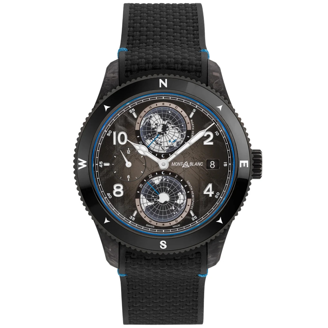 Hora mundial de Manufactura Montblanc, que incluye globos giratorios con hemisferios norte y sur, escala de 24 horas, indicaciones de día y noche, función Dual Time y fecha.