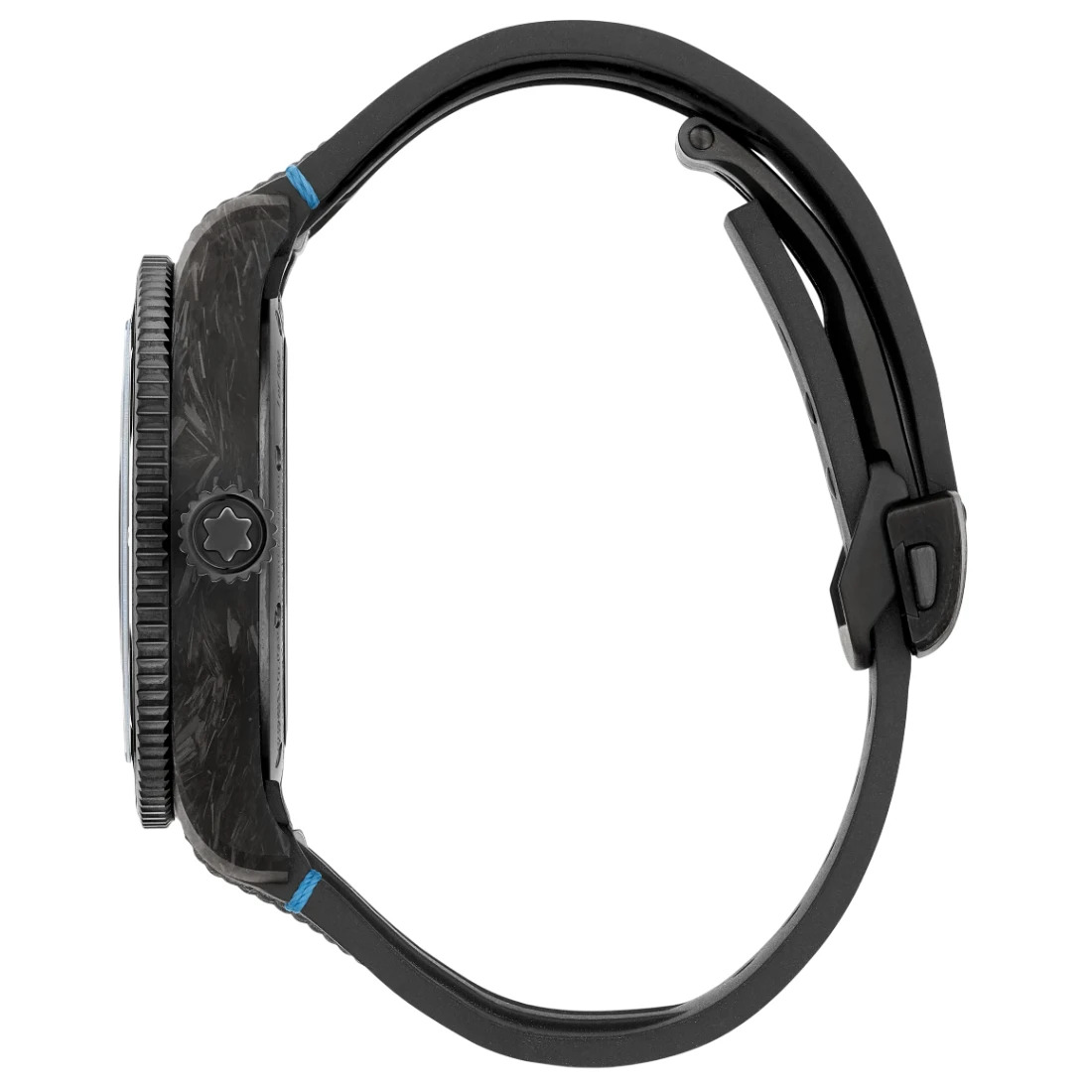 Grabado del contorno azul y luminoso del Mont Blanc en el lateral y otro de la montaña, grabado con láser 3D en color, en la tapa trasera de titanio