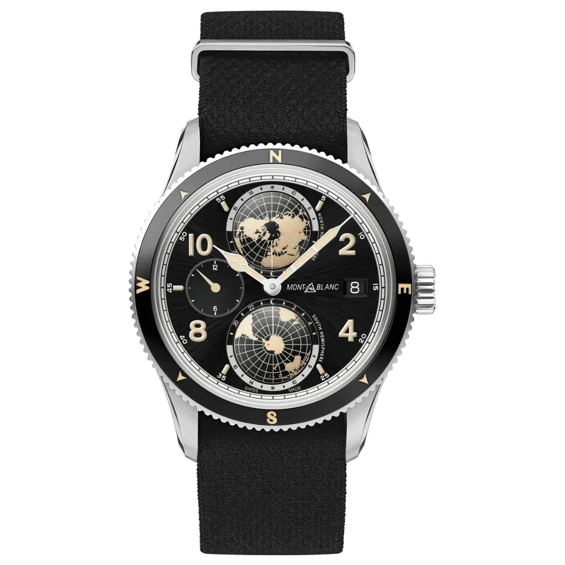 Celebrando el 160.º aniversario de Minerva, el Montblanc 1858 Geosphere rinde homenaje a los héroes del alpinismo con un innovador reloj de calidad profesional. Creado para aquellos que viajan por el mundo en su búsqueda perpetua de exploración, expresa respeto por los verdaderos montañeros, ya que está dedicado al Seven Summits Challenge, el santo grial de los escaladores. La combinación de materiales como el acero y la cerámica subraya la alta calidad y exclusividad de este reloj. En la esfera, las siete cumbres del mundo están marcadas con puntos rojos en dos globos giratorios y también están grabadas en el fondo de la caja. El reloj presenta una complicación de hora mundial de nueva manufactura desarrollada por los relojeros de Montblanc en Villeret: dos globos abovedados que giran en direcciones opuestas y completan una rotación completa en 24 horas. Ambos están rodeados por una escala con los 24 husos horarios, junto con una indicación de día y noche en colores contrastantes. Esto proporciona una forma instintiva de apreciar las diferentes zonas horarias, con la ayuda de SuperLumiNova® aplicado a los continentes para aumentar la visibilidad y el rendimiento por la noche.