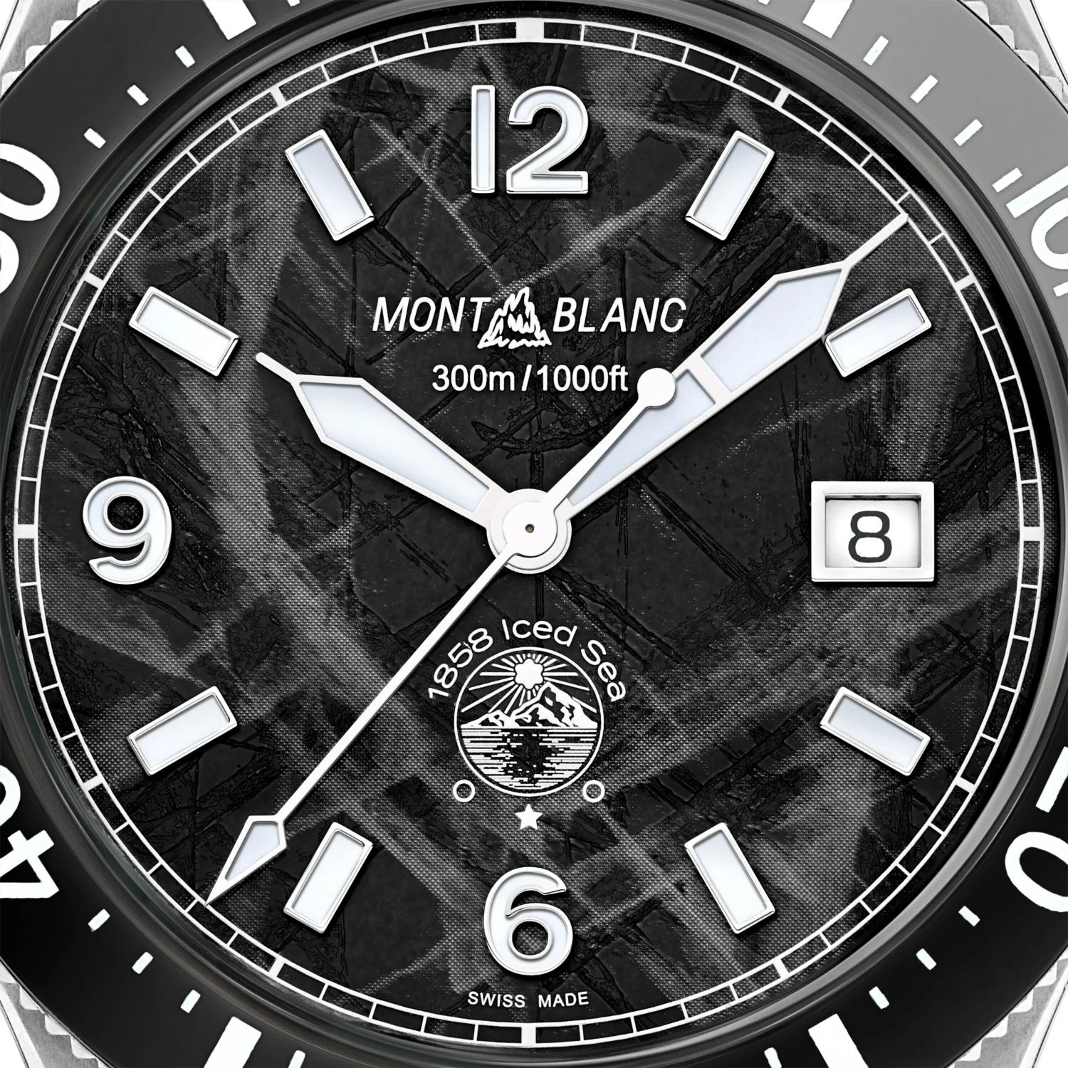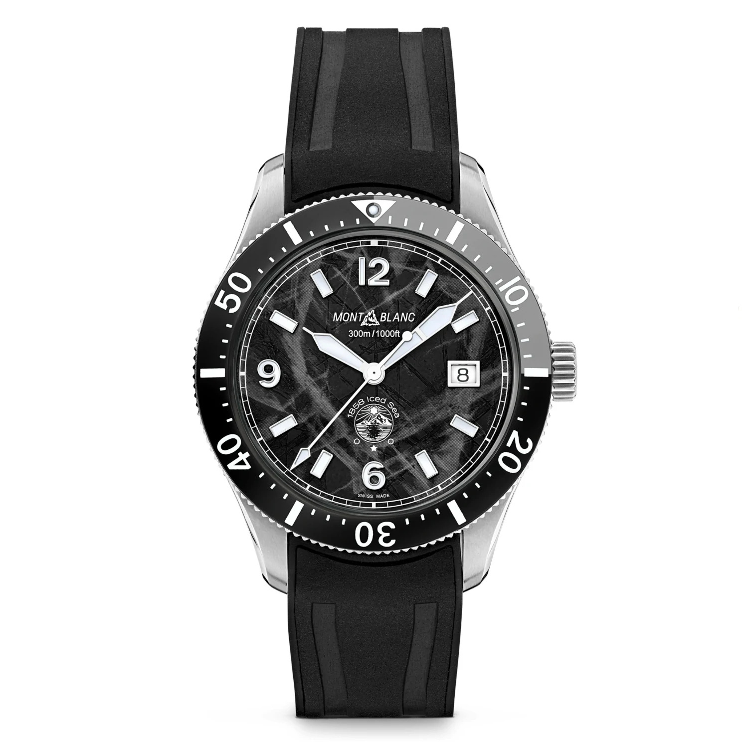 MATERIAL DE LA CAJA: Acero ESFERA: Esfera negra con motivo de glaciar y números árabes rodiados luminiscentes BISEL: Bisel giratorio en una dirección FORMA DEL CRISTAL: Abombado DESCRIPCIÓN DEL CRISTAL: Cristal abombado con revestimiento antirreflejante TIPO DE CRISTAL: Zafiro CORONA: Atornillada y acanalada de acero con emblema Montblanc en relieve DISTANCIA ENTRE LAS BARRAS: 20 mm COLOR DE LA LUNETA: Negro RESISTENTE AL AGUA: 30 bar (300 m) bar MATERIAL DE LA PARTE TRASERA DE LA CAJA: Caja de acero con bisel unidireccional de cerámica bicolor COLOR DE LA PULSERA: Negro DIÁMETRO DE LA CAJA: 41 mm MATERIAL DE LA LUNETA: Acero - Cerámica