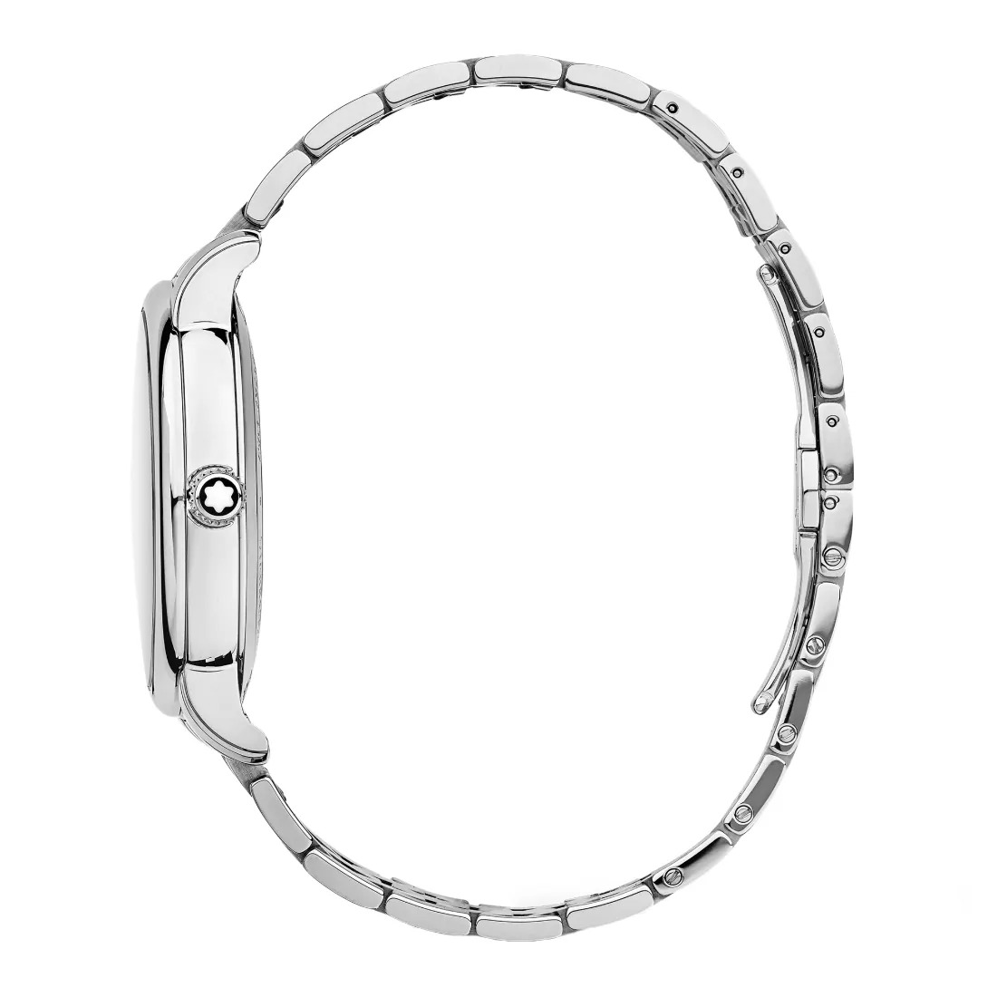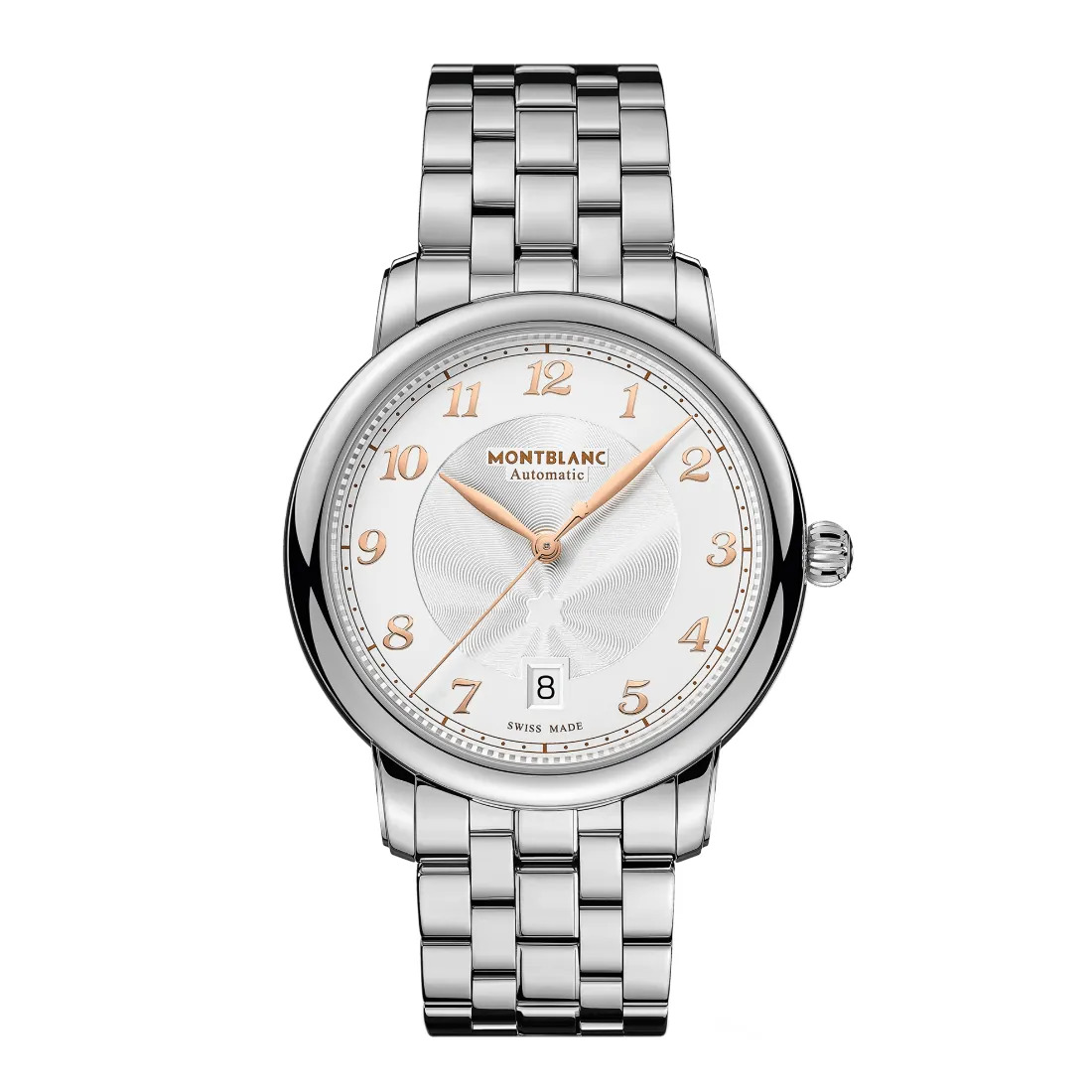 MATERIAL DE LA CAJA: Acero ESFERA: Esfera plateada-blanca con números árabes chapados en oro rosa BISEL: Fijo CRISTAL ANTIRRAYADO: Sí FORMA DEL CRISTAL: Abombado DESCRIPCIÓN DEL CRISTAL: Tapa trasera de cristal de zafiro TIPO DE CRISTAL: Zafiro CORONA: Acero con emblema Montblanc RESISTENTE AL AGUA: 5 bar (50 m) bar MATERIAL DE LA PARTE TRASERA DE LA CAJA: Caja de acero DIÁMETRO DE LA CAJA: 39 mm MATERIAL DE LA LUNETA: Acero