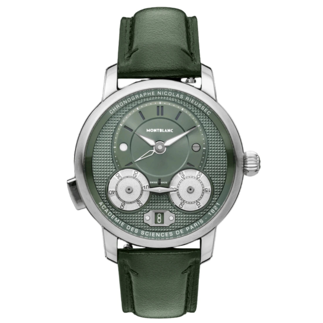 El reloj Montblanc Star Legacy Nicolas Rieussec Chronograph refuerza la conexión parisina con diversos elementos para rendir homenaje a la ciudad de la luz. Un motivo Clou de Paris gráfico en la elegante esfera verde, que continúa en la masa oscilante, se inspira en el diseño geométrico de las calles adoquinadas de París. Las inscripciones en francés de "Académie des Sciences de Paris" y "Chronographe Nicolas Rieussec" están grabadas en el realce, como recordatorio de que la academia validó la invención de Rieussec en 1821.