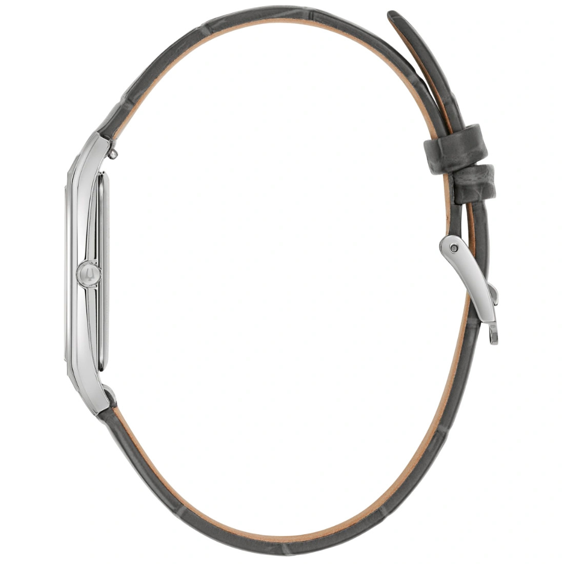Reloj Bulova para Caballero Movimiento de cuarzo de 3 manecillas y fechador en posición de las 6Hrs. Caja rectangular realizada en acero inoxidable. Carátula gris texturizada, indicadores en números romanos y manecillas en oro rosa. Correa de piel gris obscuro acabado tipo cocodrilo, broche tipo hebilla de 3 piezas. Cristal de zafiro