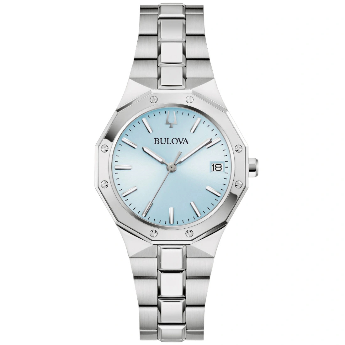 Reloj Bulova para dama, colección clásicos. Movimiento de cuarzo con 3 manecillas. Fechador situado a las 3 hrs. Caja en forma de polígono de 12 lados. Brazalete de 3 eslabones de acero inoxidable cepillado. Broche desplegable con doble pulsador. Carátula azul claro. Indicadores y manecillas color plateado luminiscentes.