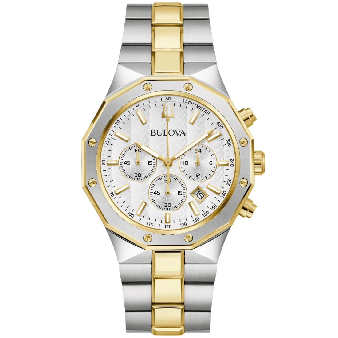 El diseño moderno y audaz caracteriza a este cronógrafo de 6 agujas de la colección Classic de Bulova Prestige para hombre. El reloj cuenta con una caja facetada de acero inoxidable en tono dorado y plateado con un cristal de zafiro con bisel geométrico plano con tratamiento antirreflectante, resistencia al agua. Altamente funcional con un diseño distintivo, este reloj es adecuado para cualquier ocasión, desde la más cotidiana hasta la extraordinaria.