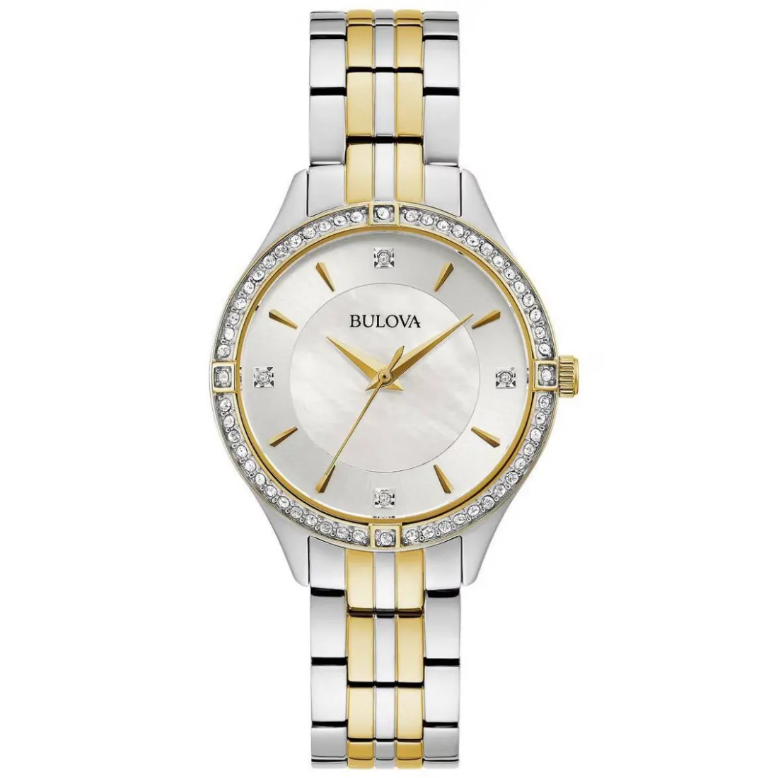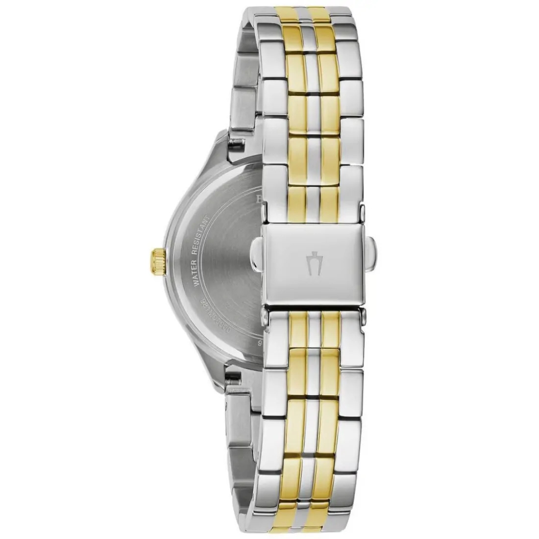 Reloj Bulova para Dama Movimiento de cuarzo de 3 manecillas Caja y brazalete realizados en acero inoxidable acabado, broche desplegable de doble pulsador Carátula plateada, con manecillas e indicadores en dorado.