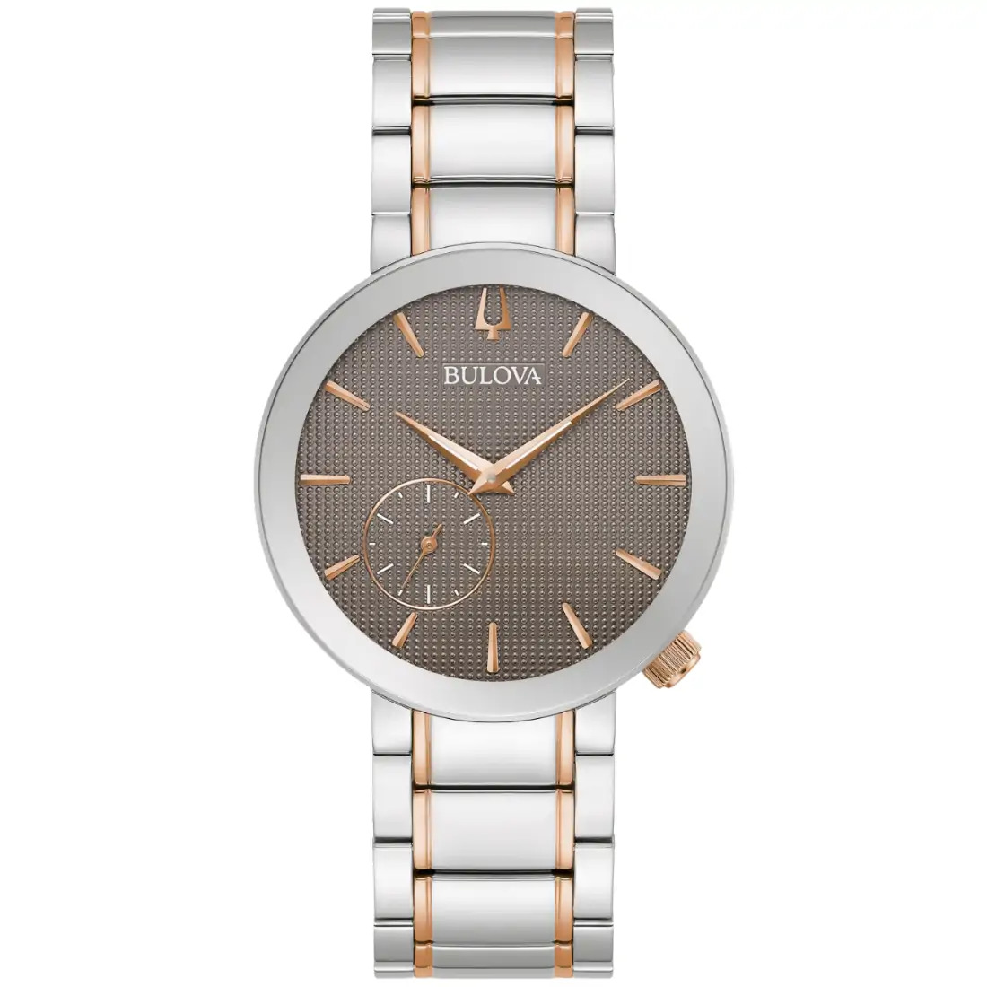 El dial texturado se resalta con manecillas y marcadores de tono oro rosa y con un subdial de segundos de barrido. En la parte posterior del reloj, la tapa enroscable tiene grabado el logotipo de Latin GRAMMY®. El reloj se combina a la perfección con un brazalete de dos tonos a juego y un cierre con hebilla desplegable. Lleve el espíritu de los premios GRAMMY® latinos y sus increíbles artistas con este nuevo reloj Bulova para mujer. Este nuevo reloj Bulova para mujer se suma a la colección Latin GRAMMY® y continúa con la celebración de la marca de la premiación y los increíbles artistas que hacen esto posible.