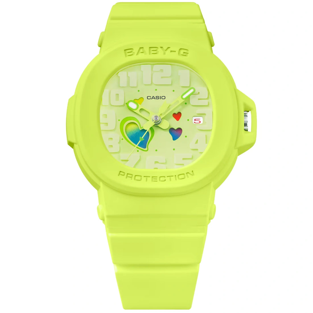 Tamaño de la caja (largo × ancho × alto): 46.6 × 42.1 × 11.4 mm Material de la caja/bisel: Resina Peso: 34 g Correa de resina Resistente a impactos Resistencia al agua de 100 m Fuente de alimentación: pila