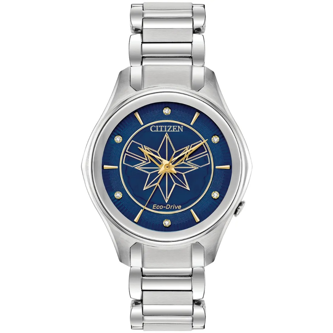 Una hermosa combinación que destaca, el reloj Marvel Captain Marvel de Citizen es precisamente eso.la reconocible estrella dorada y detalles en tono dorado en una caja y pulsera de acero inoxidable con esfera azul marino y marcadores de cristal. Con nuestra tecnología Eco-Drive, alimentada por luz, cualquier luz.