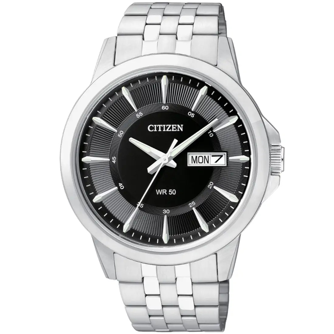 Un clásico reloj de cuarzo de CITIZEN® con diseño limpio que combina en cualquier ocasión. Su carátula negra destaca contra la caja y brazalete en acero inoxidable. Cuenta con fecha y día.