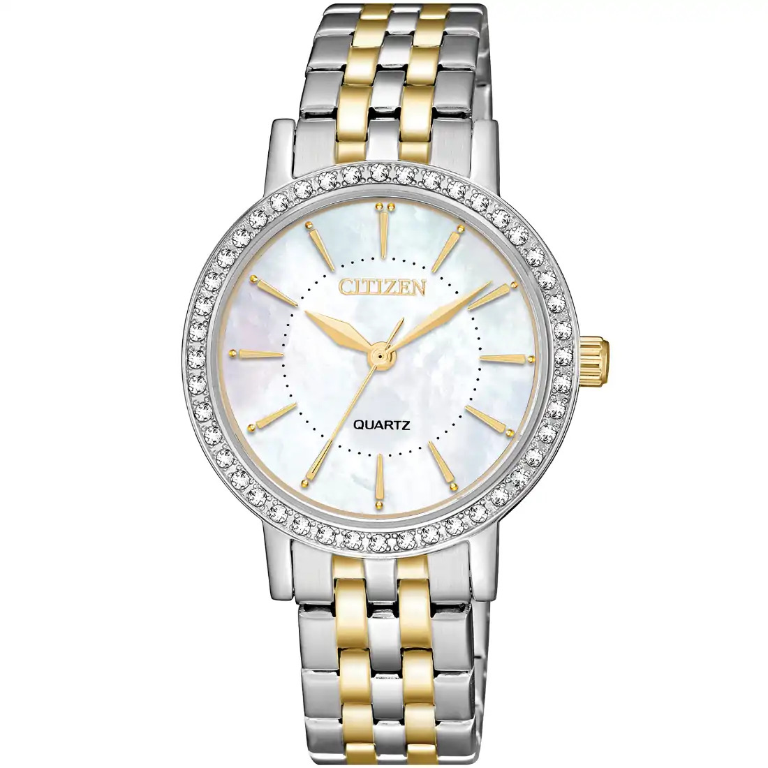 Elegante reloj de cuarzo para dama. Con caja y brazalete en acero inoxidable bitono, este reloj destaca por sus detalles de cristales en el bisel.