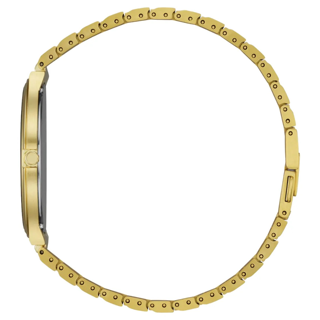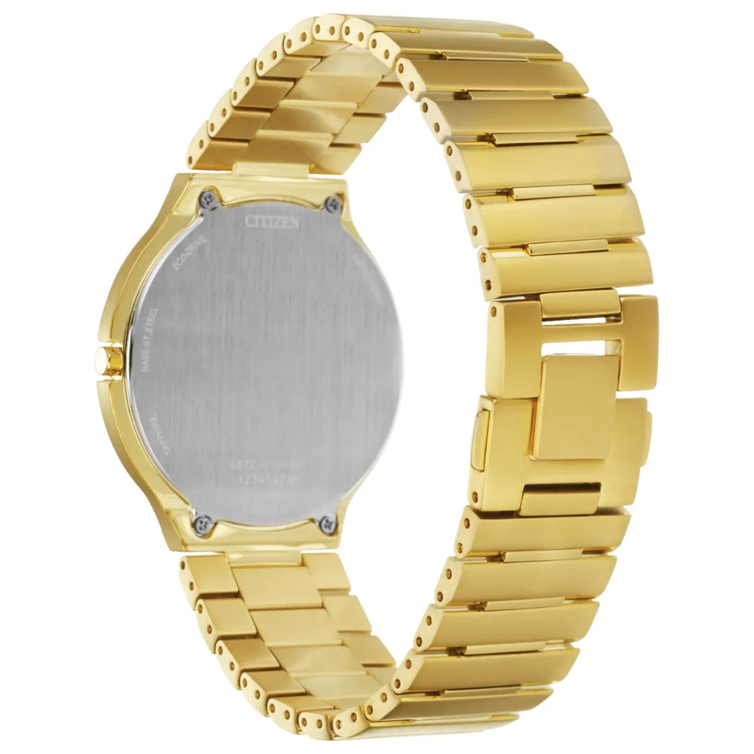 El miembro más reciente de la colección CITIZEN Stiletto ofrece un estilo minimalista que no te puedes perder. Su delgada caja de 4.8 mm de grosor con diseño asimétrico único y corona cuidosamente oculta ofrece un look moderno y audaz. La caja y el brazalete de acero inoxidable dorado se combinan con un carátula negra de dos manecillas que logran una apariencia y una sensación completamente impecables.