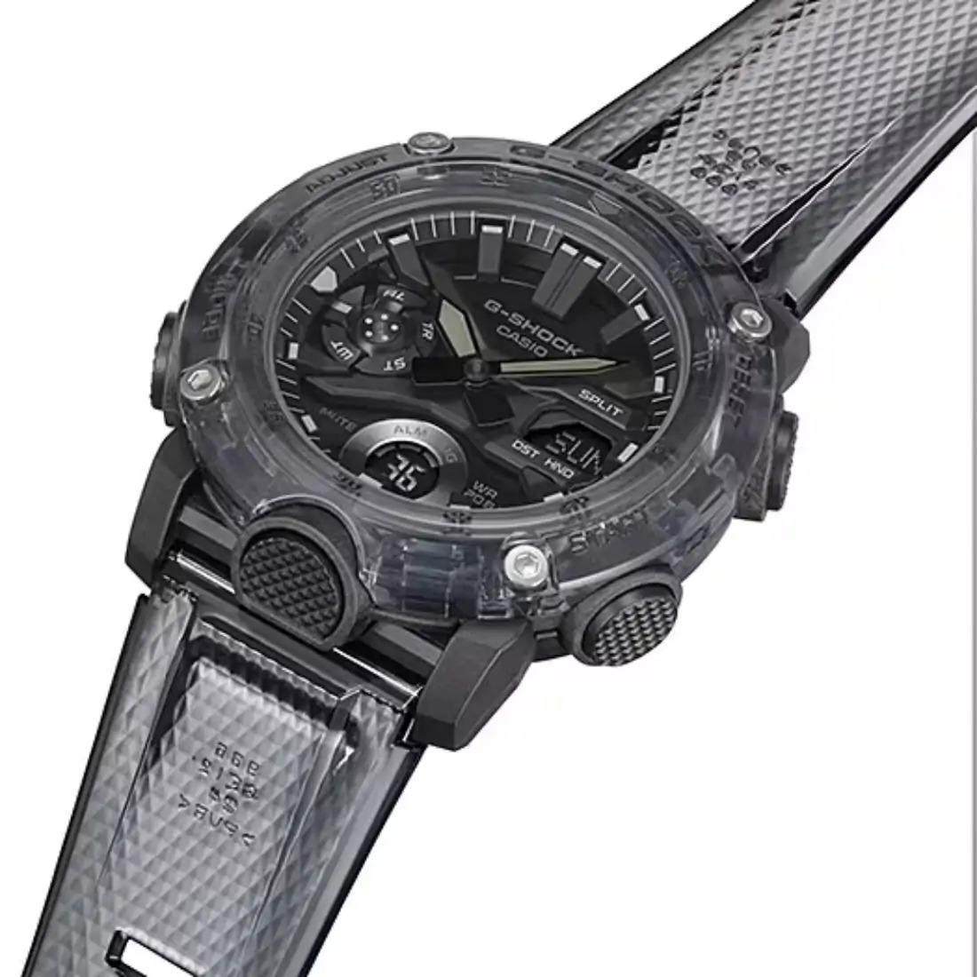 Tamaño de la caja (L× W× H): 51.2 × 47 × 14.1 mm Material de la caja/bisel: Carbono/resina Peso: 63 g Correa de resina Resistente a impactos Resistencia al agua de 200 m Fuente de alimentación: pila