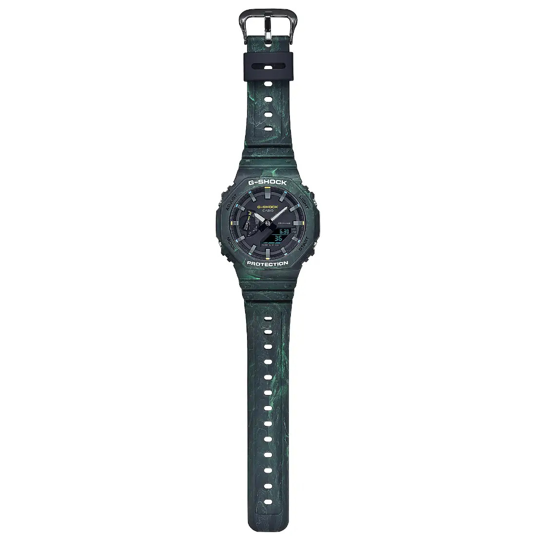 Tamaño de la caja (L× W× H): 48.5 × 45.4 × 11.8 mm Material de la caja/bisel: Carbono/resina Peso: 51 g Correa de resina Resistente a impactos Estructura Carbon Core Guard Resistencia al agua de 200 m Fuente de alimentación: pila