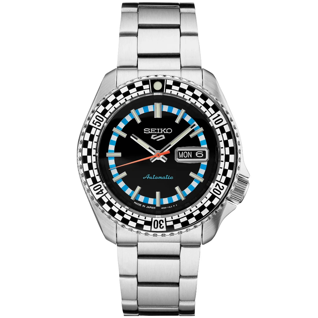 Seiko 5 Sports Edición Especial. Durante décadas, Seiko 5 Sports ha ofrecido niveles consistentemente altos de fiabilidad, durabilidad y rendimiento. Este dinámico reloj presenta un estilo actual con un toque vintage, con una caja actualizada y una carátula simplificada, pero manteniendo la clásica combinación de colores plateado y azul. Inspirado en los modelos vintage de Seiko 5 Sports de las décadas de 1960 y 1970.