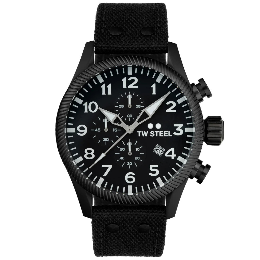 Material del brazalete Lona negra sobre correa de cuero con costuras negras.