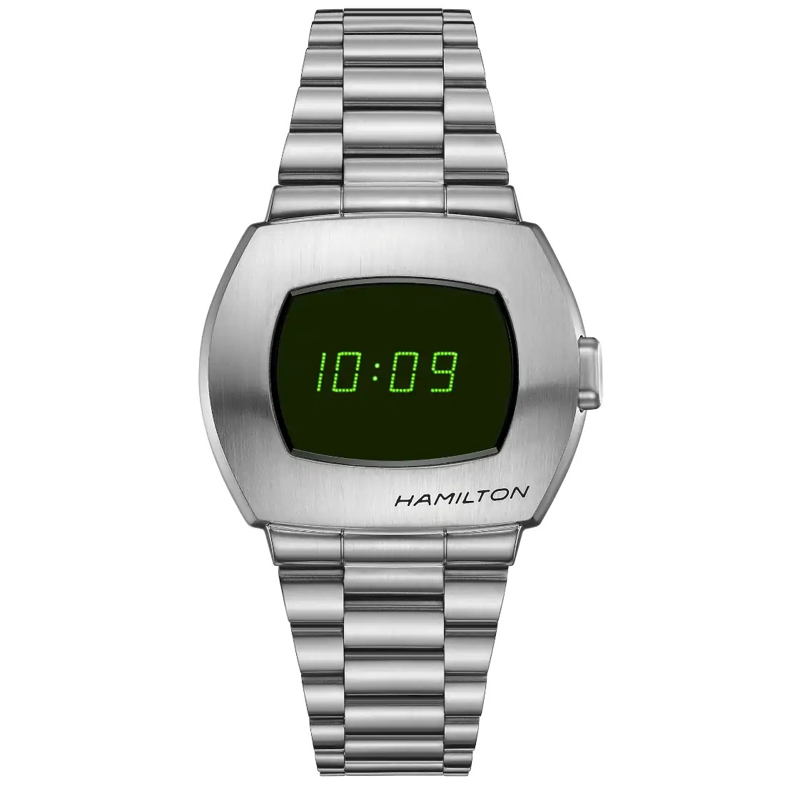 El icónico Hamilton PSR Digital Quartz supone una continuación de la historia de innovación que inauguró el primer reloj eléctrico del mundo en 1970. Con una pantalla digital híbrida que combina las tecnologías LCD y OLED, sus números verdes son fáciles de leer a simple vista durante el día y cuenta con un pulsador para mejorar la legibilidad durante la noche.