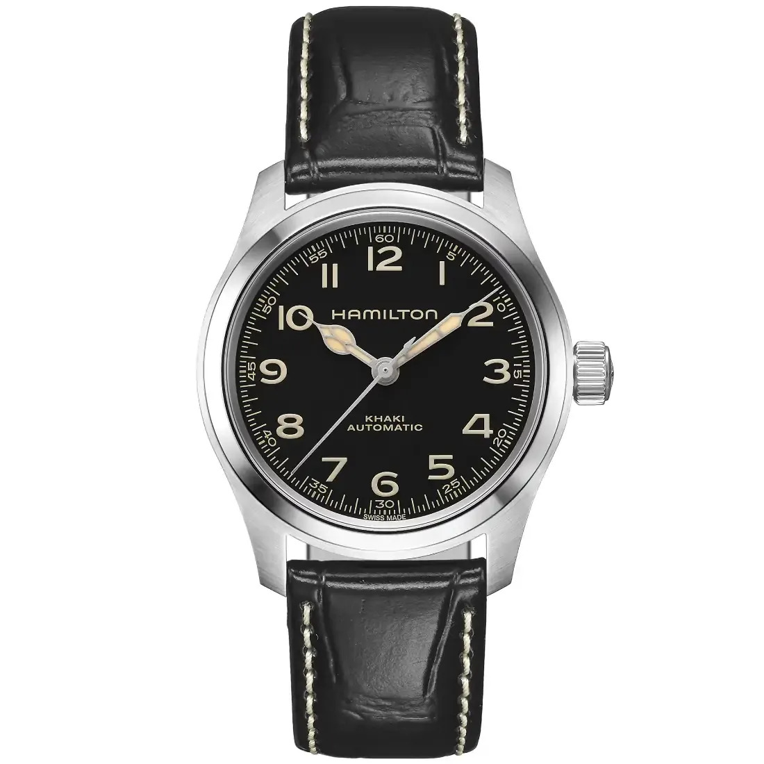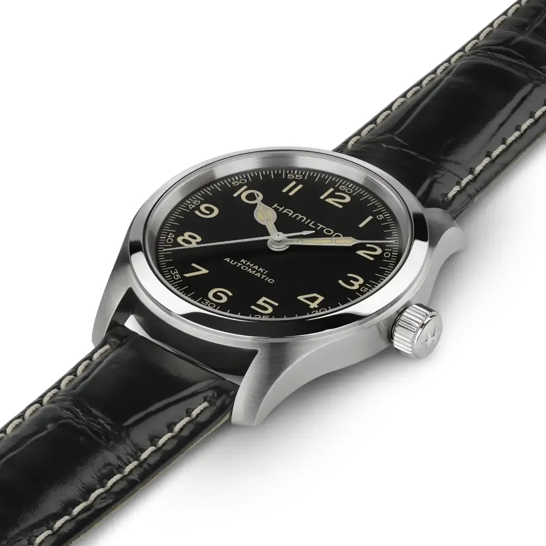 El Khaki Field Murph Auto de 38 mm ya está aquí. Uno de los relojes más famosos de la ciencia ficción, conocido por sus seguidores como "el Murph", ahora viene en una caja de acero inoxidable de 38 mm. Gracias a su esfera negra de gran legibilidad, sus agujas beige de estilo vintage con acabado de Super-LumiNova® y su correa de piel negra, refleja los códigos estéticos clave de su predecesor de 42 mm. Equipado con el movimiento automático H-10 y con una reserva de marcha de 80 horas, este Khaki Field Murph Auto cautiva los corazones de los enamorados de los relojes más pequeños.