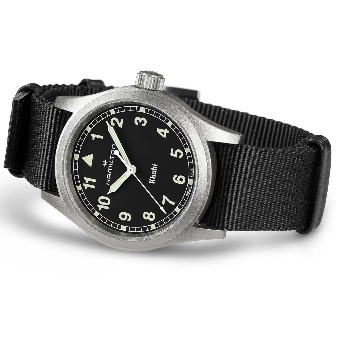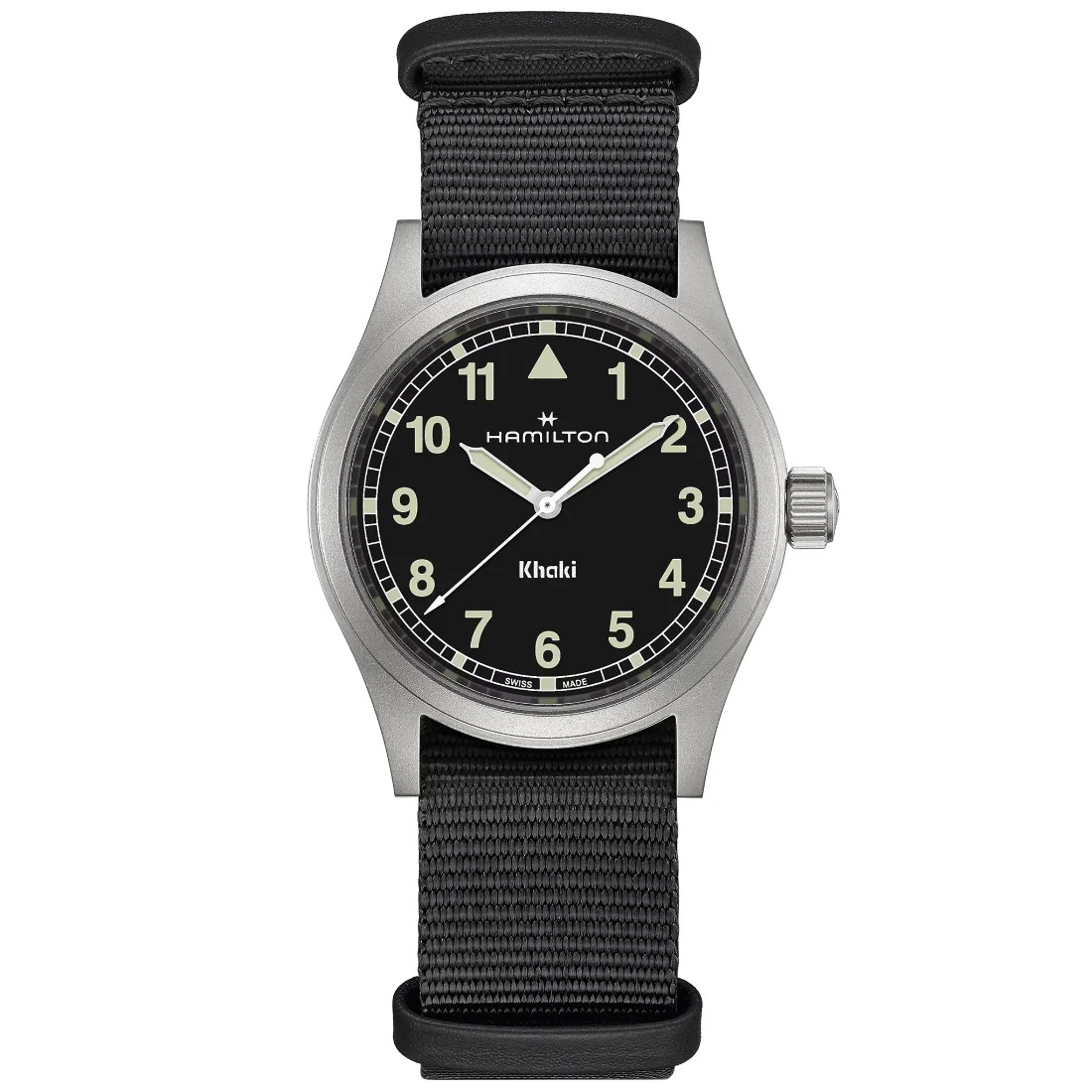 El reloj Khaki Field Quartz expresa el regreso al legado militar de Hamilton a través de la sencillez en el diseño. La esfera presenta una tipografía clara con números arábigos más rectos y un minutero de vía ferroviaria. La paleta de colores es discreta, con su elegante esfera negra realzada con índices con Super-LumiNova® verde claro.