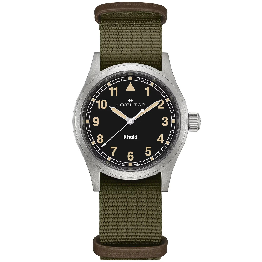 El reloj Khaki Field Quartz expresa el regreso al legado militar de Hamilton a través de la sencillez en el diseño. La esfera presenta una tipografía clara con números arábigos más rectos y un minutero de vía ferroviaria. La paleta de colores es discreta, con su elegante esfera negra realzada con índices con Super-LumiNova® color radio envejecido.