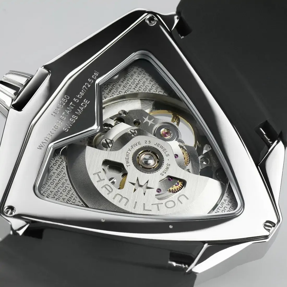 El Hamilton Ventura lanza, su declaración más osada a través de una edición XXL. Este especial reloj integra unos sorprendentes detalles que inyectan a su inspiración clásica un sentimiento futurista y de vanguardia. La conocida forma de escudo de la caja color bronce le confiere un look contemporáneo inconfundible a través de sus pulidas superficies y de sus dimensiones XXL.