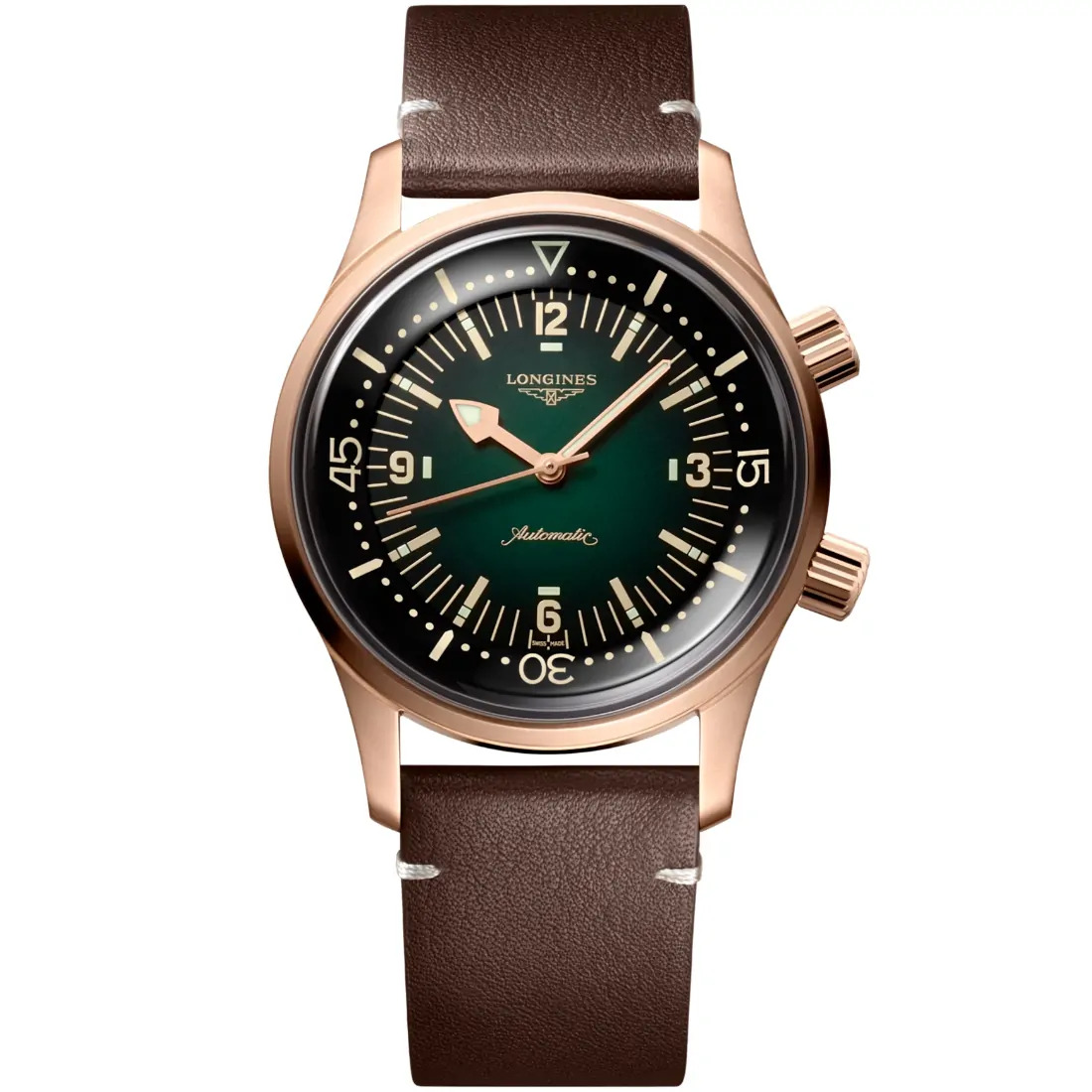 Color esfera: Verde Círculo horario: Índices y números árabes pintados Agujas: Agujas rosa Características: Swiss Super-LumiNova