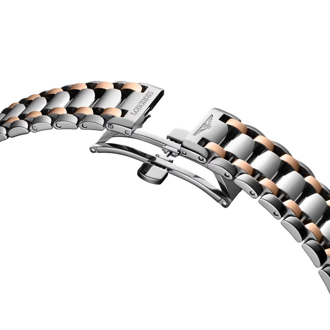 Material: Acero inoxidable y lámina 200 micras de oro rosa de 18 quilates Hebilla: Con triple cierre desplegable de seguridad y mecanismo de apertura mediante pulsador