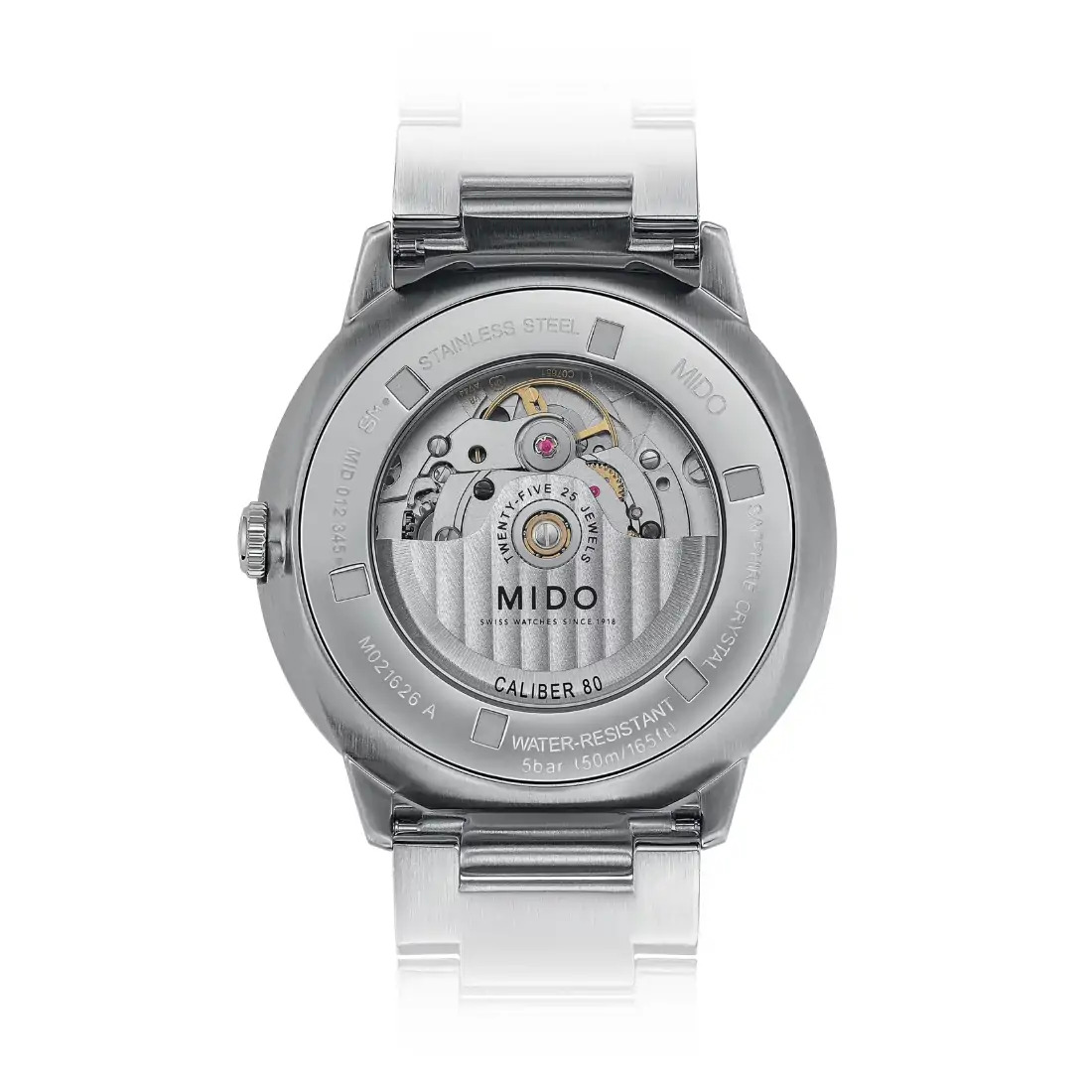Movimiento Funciones: Gran fecha Calibre: Automático Mido Calibre 80 (base ETA C07.651) Movimiento: Mido Automático Reserva de marcha: Reserva de marcha de hasta 80 horas Diámetro movimiento (mm): 28.80 Joyas:25 Calibre: 12.75