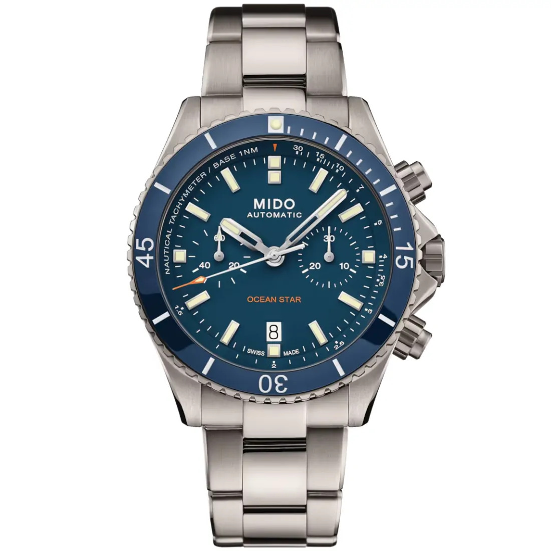 MIDO presenta el reloj Ocean Star Swiss en versión cronógrafo, una característica única en esta colección de relojes de buceo dedicada al mundo marino. Calcula la velocidad de los océanos, utilizando una escala taquimétrica en millas náuticas. El rendimiento del cronógrafo deportivo Ocean Star se basa en un calibre mecánico con una reserva de marcha de hasta 60 horas, con la ventaja añadida de un anillo de cerámica en el bisel.