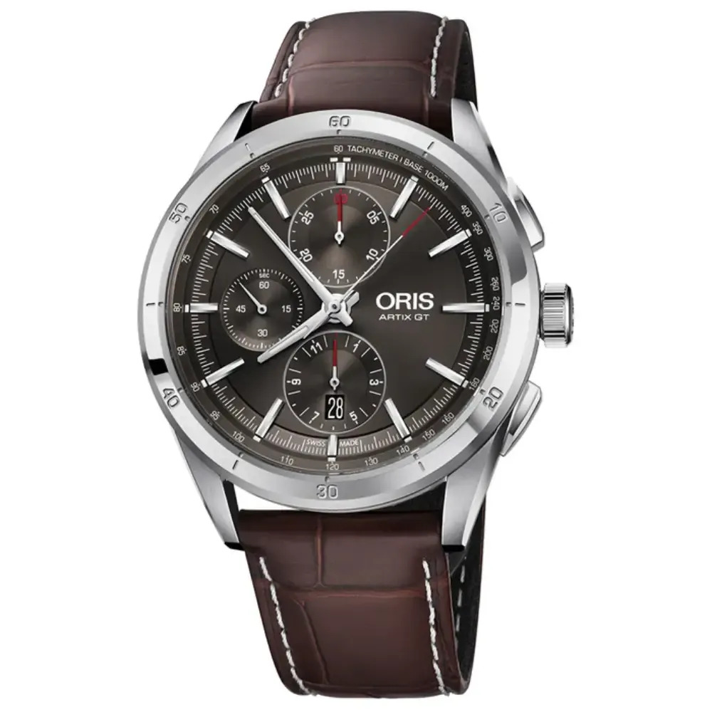 NÚMERO Oris 774, base SW 500 DIMENSIONES Ø 30.00 mm, 13 1/4’’’ FUNCIONES Agujas horas, minutos y cronógrafo 1/4 segundo centrales, 3 esferas subsidiarias para segundos continuos, 30 minutos y contador 12 horas, ventana fecha, corrrector fecha, excelente cronometrador y paro segundo REMONTE Remonte automático, con rotor rojo RESERVA DE MARCHA 62 h VIBRACIONES 28’800 A/h, 4 Hz RUBÍES 25