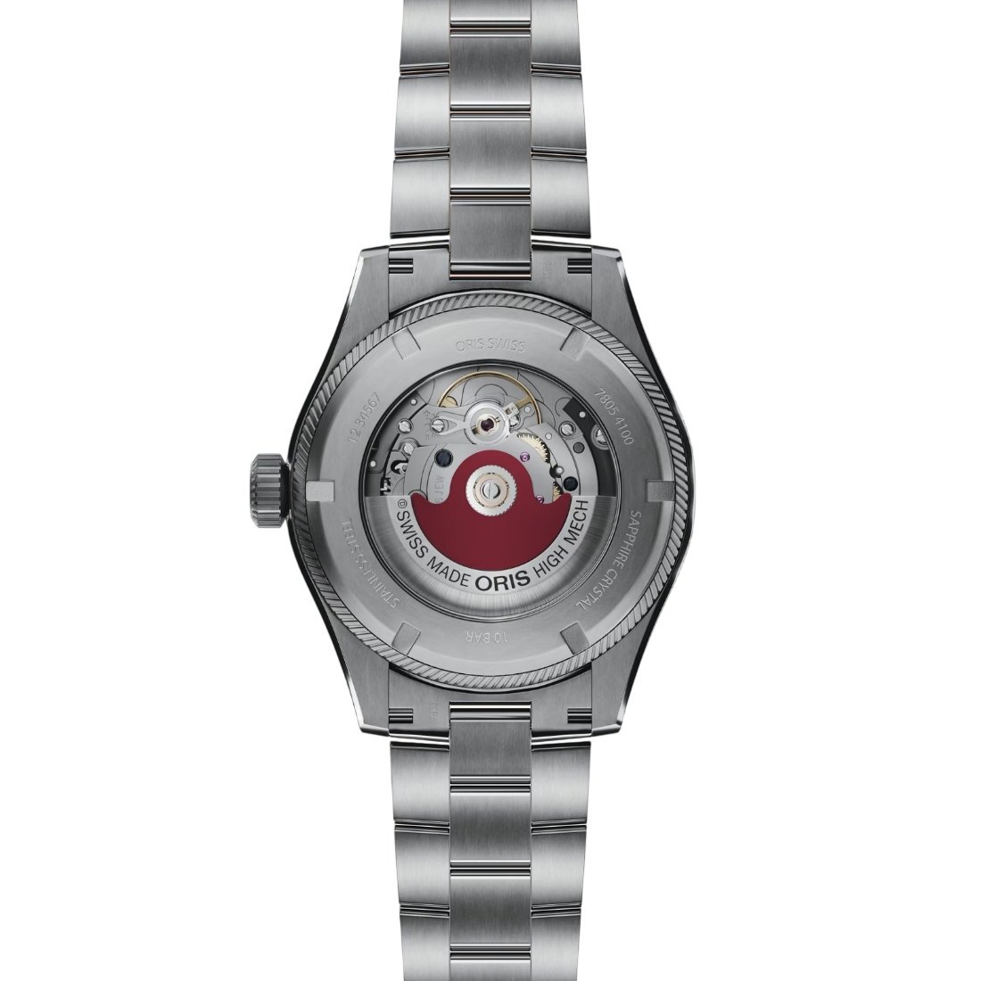 Caja de acero. Zafiro, ambas caras abombadas, capa interior antirreflejos. Acero inoxidable, atornillado, cristal mineral transparente. Diámetro: 41.00 mm, Hermeticidad: 10 bar, Anchura entre cuernos: 20 mm