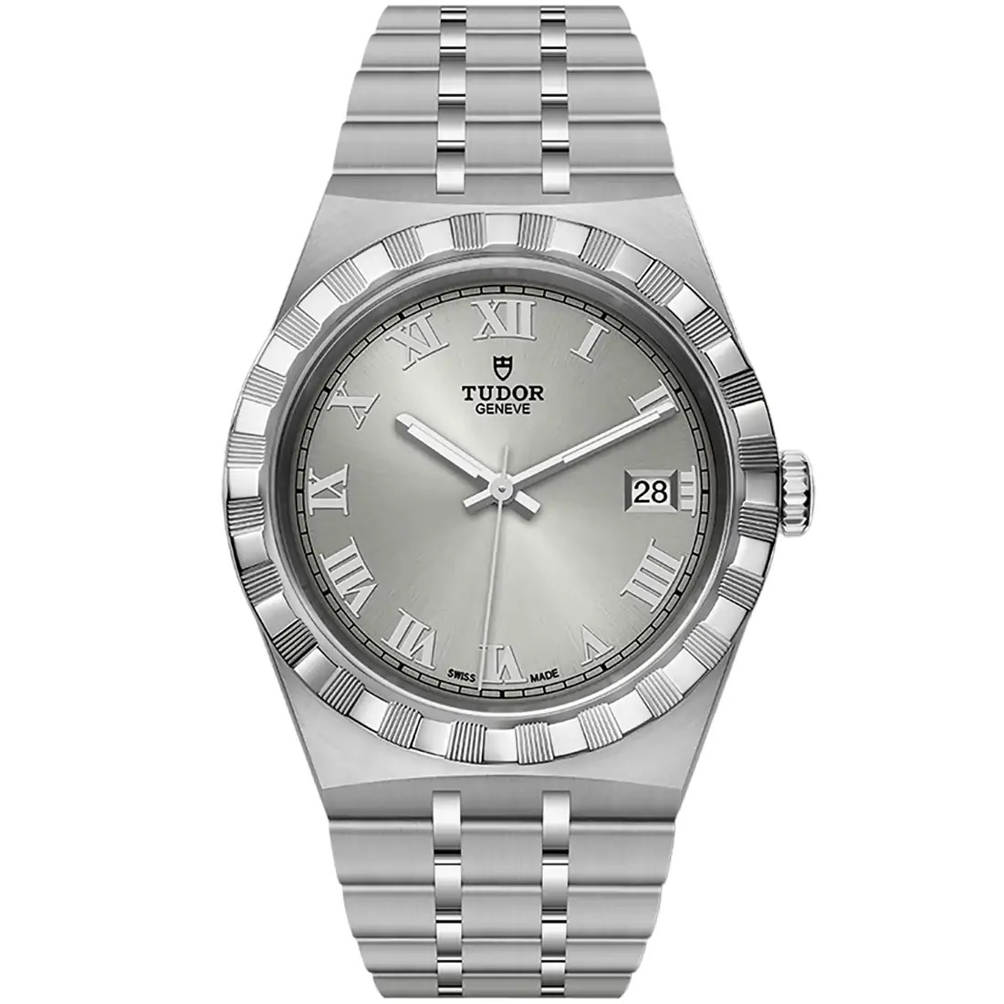 Plateada, con acabado «sunray» Números romanos Fecha a las 3 horas