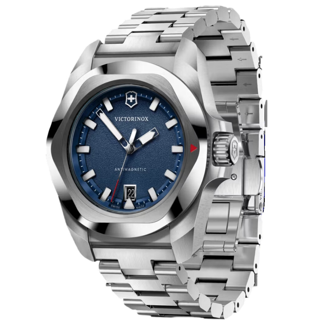 Un tributo moderno al legado de la Swiss Army Knife™: este reloj fusiona historia y vanguardia con una esencia propia de diseño. El reloj I.N.O.X. Cuarzo, diseñado y fabricado en Suiza, combina la precisión con la funcionalidad cotidiana. Presenta una esfera mate con índices en relieve y manecillas luminosas que facilitan la lectura de día y de noche, además de un indicador de fecha a las 6. El bisel cepillado y pulido añade refinamiento, mientras que el sistema de brazalete de metal intercambiable asegura un uso versátil y cómodo.